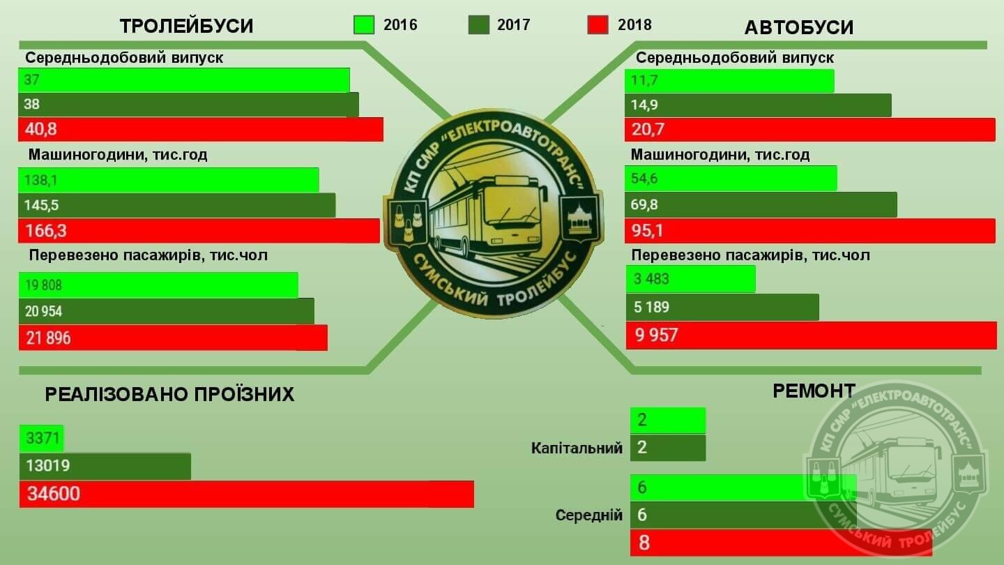 Можна було б просто навести показники року, що минув… Проте, враховуючи побажання громади м. Суми, вирішили відобразити динаміку розвитку підприємства у період з 2016 по 2018 р.р. Завдяки підтримці міської влади, оновлюється рухомий склад ДЕПО: у 2018-му було придбано та випущено на лінію 4 автобуси та 4 тролейбуси. Розроблені й введені у дію кілька нових маршрутів. Не можна оминути увагою і появу нової тролеї у місті. Підприємство має план розвитку на найближчі 3 роки. “Чітко простежується тенденція збільшення основних показників і один з головних – це кількість реалізованих проїзних квитків. З 2016 року цифра зросла в 10(!) разів. А це свідчить як про зільшення попиту населення на послуги комунального транспорту, так і про рівень довіри громади до самого КП”, – зазначає директор КП СМР “Електроавтотранс” Віталій ОДНОРОГ.